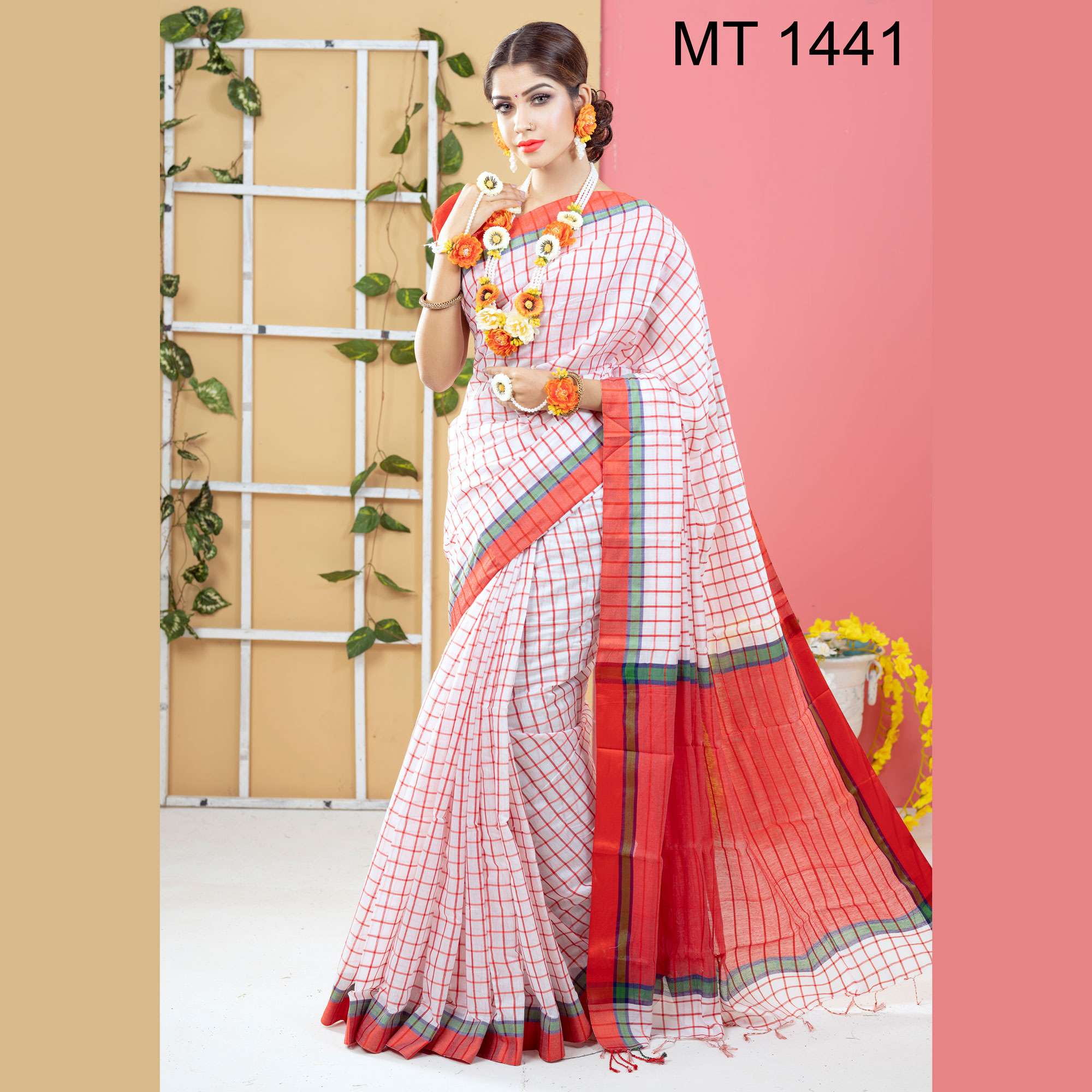 টাঙ্গাইল তাঁতের সফ্ট হাফ সিল্ক চেক শাড়ী ব্লাউজ পিছ সহ (MT-1441)