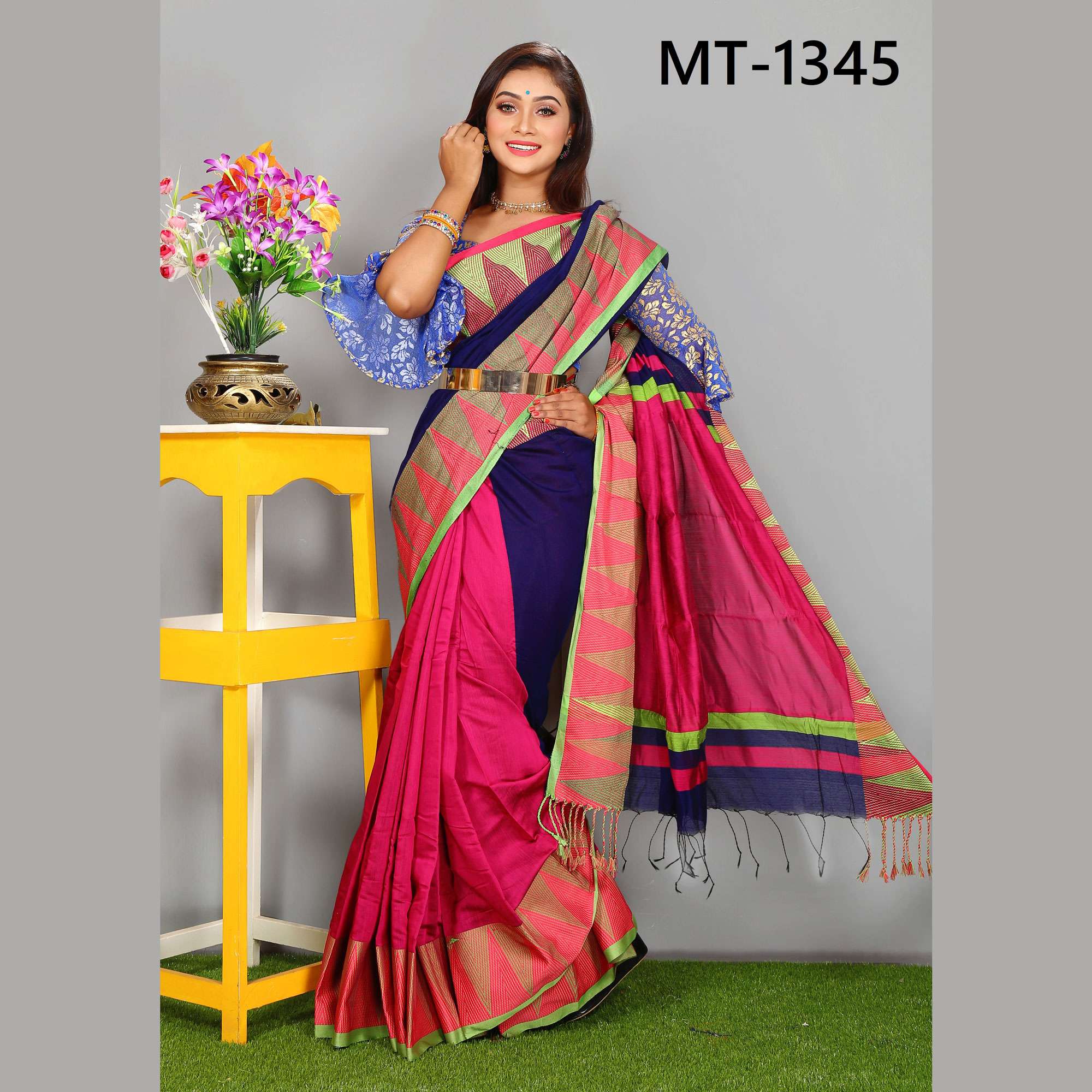 টাঙ্গাইল তাঁতের সফ্ট হাফ সিল্ক টেম্পল পাড় শাড়ী ব্লাউজ পিছ সহ (MT-1345)