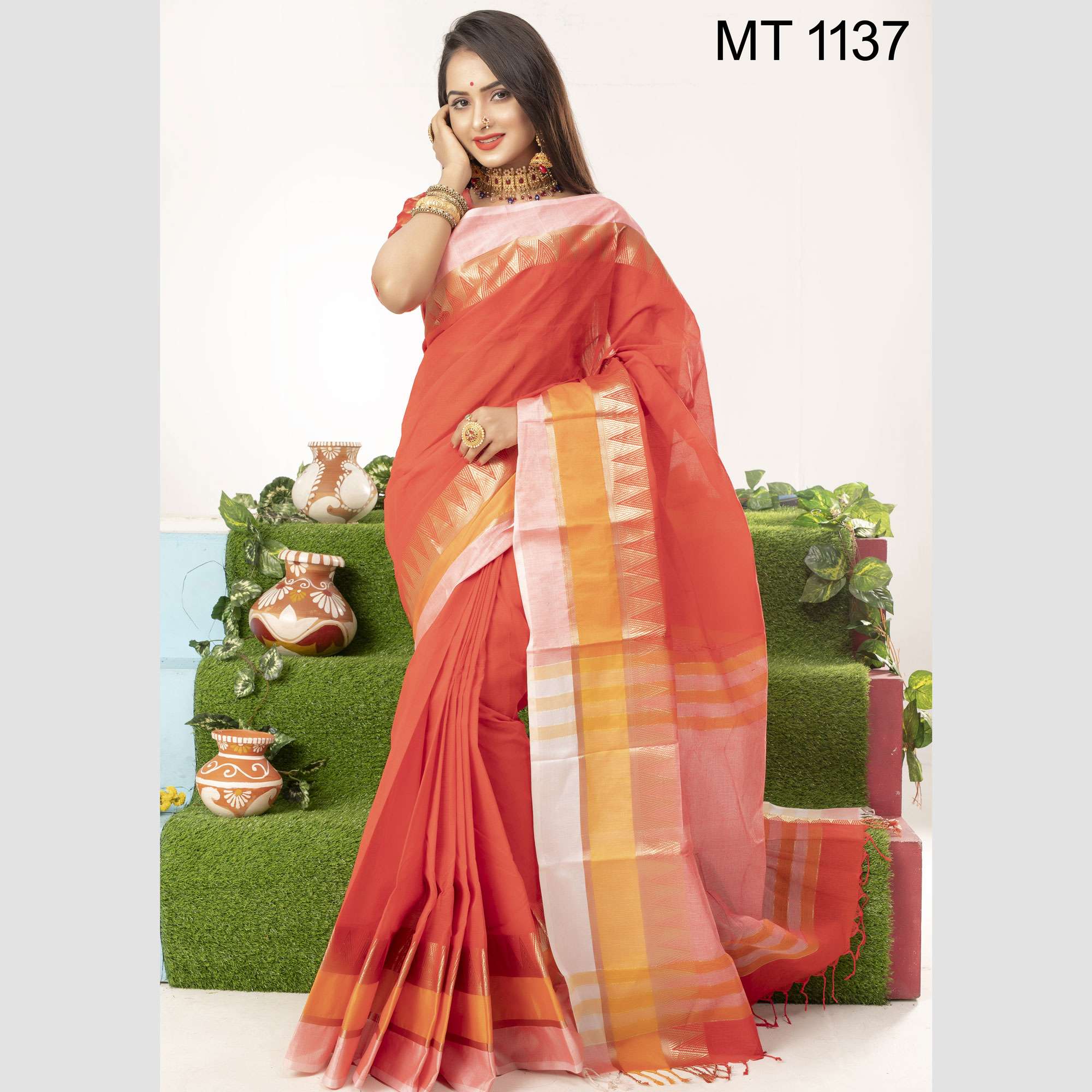 টাঙ্গাইল তাঁতের সুতি বড় টেম্পল পাড় শাড়ী ব্লাউজ পিছ সহ (MT-1137)