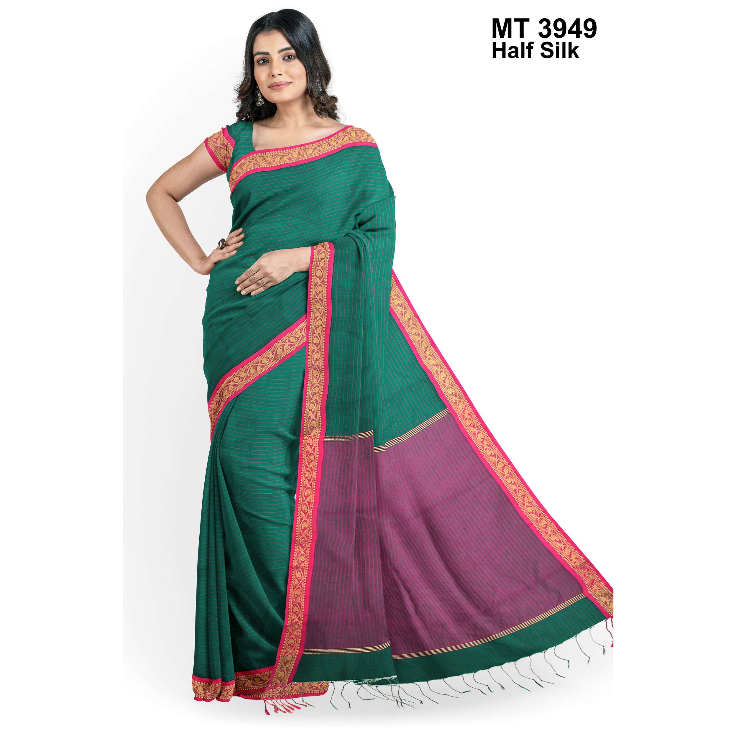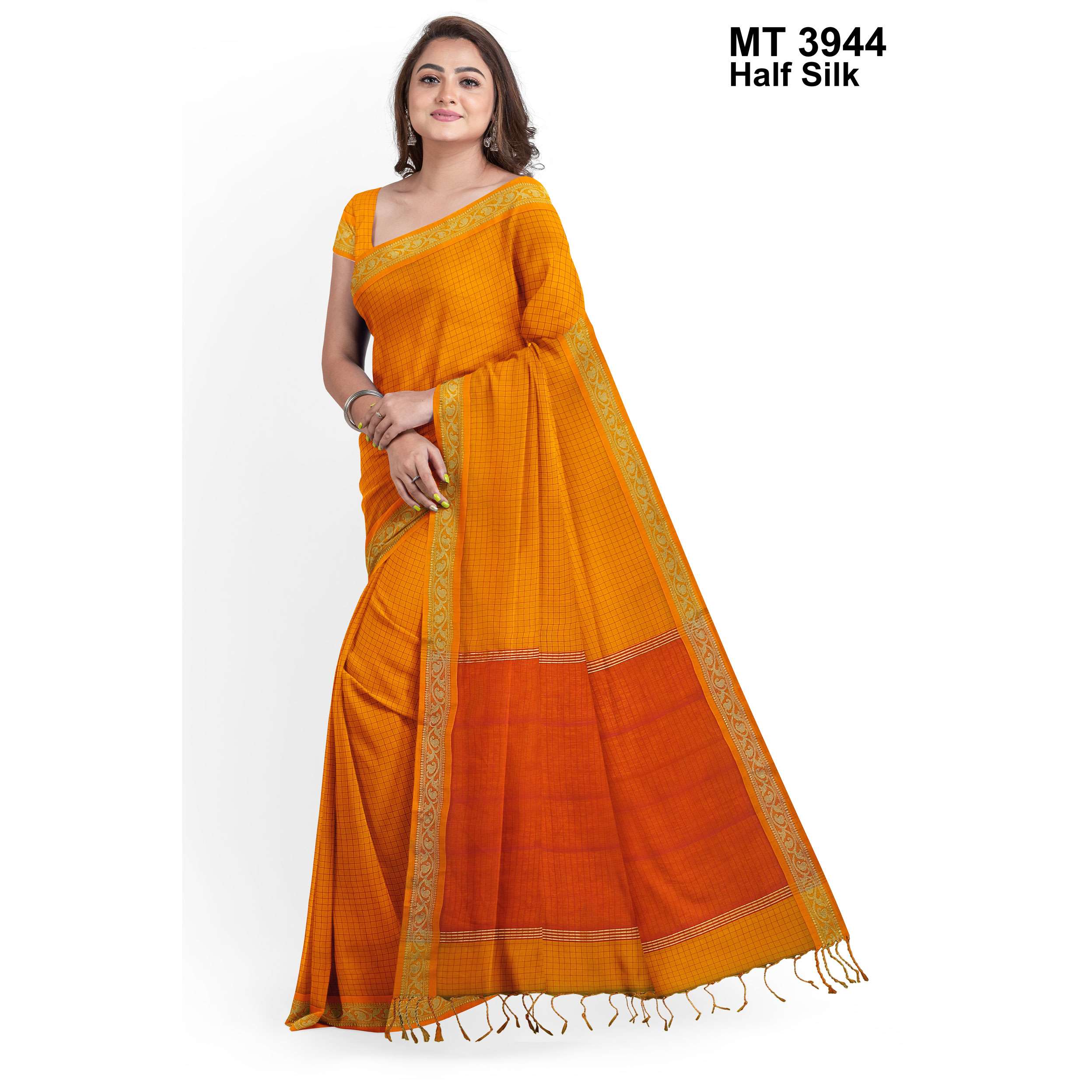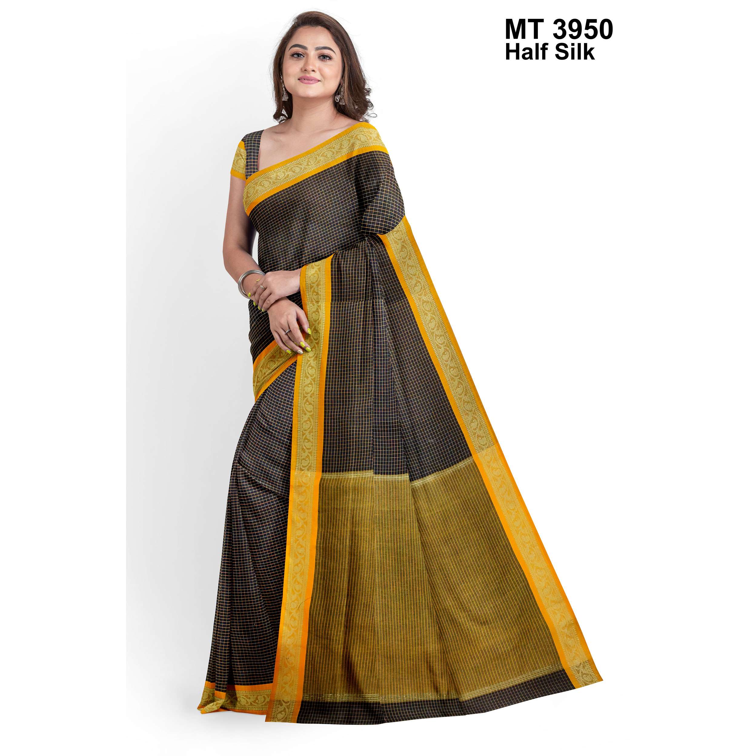 টাঙ্গাইলের ঐতিহ্যবাহী হাফ সিল্ক বুননের এক নান্দনিক উপস্থাপন। এতে রয়েছে সুন্দরভাবে হাতে বোনা কাজ ও সূক্ষ্ম ডিজাইন, যা শাড়িটিকে করে তুলেছে আলাদা ও দৃষ্টিনন্দন। আঁচল এবং পাড়ে নকশার নিপুণতা চোখে পড়ার মতো। এটি এমন একটি শাড়ি যা পরিধানে এনে দেয় আত্মবিশ্বাস ও আভিজাত্য।
