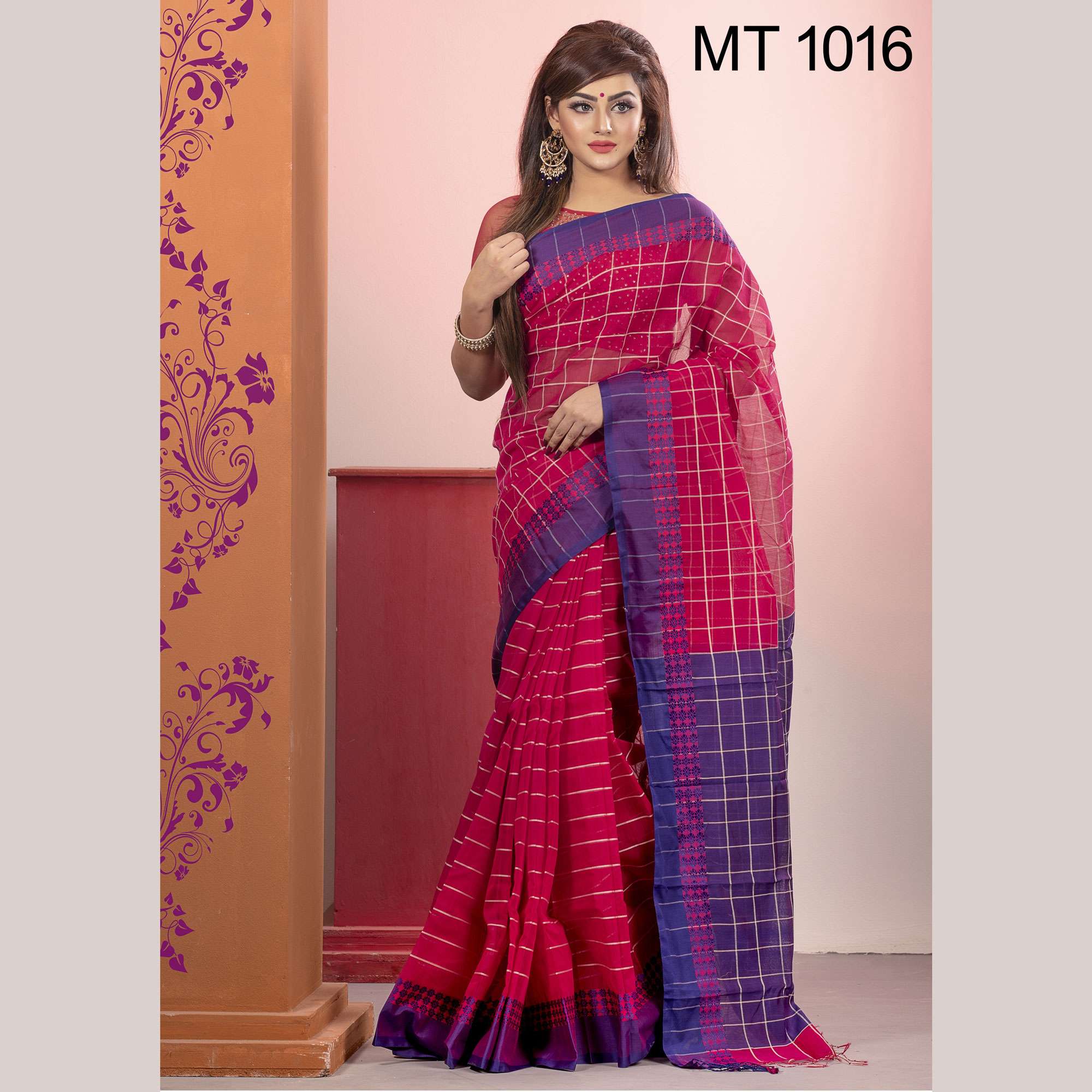 টাঙ্গাইল তাঁতের হাফ সিল্ক ফুল পাড় চেক শাড়ী ব্লাউজ পিছ সহ (MT-1016)