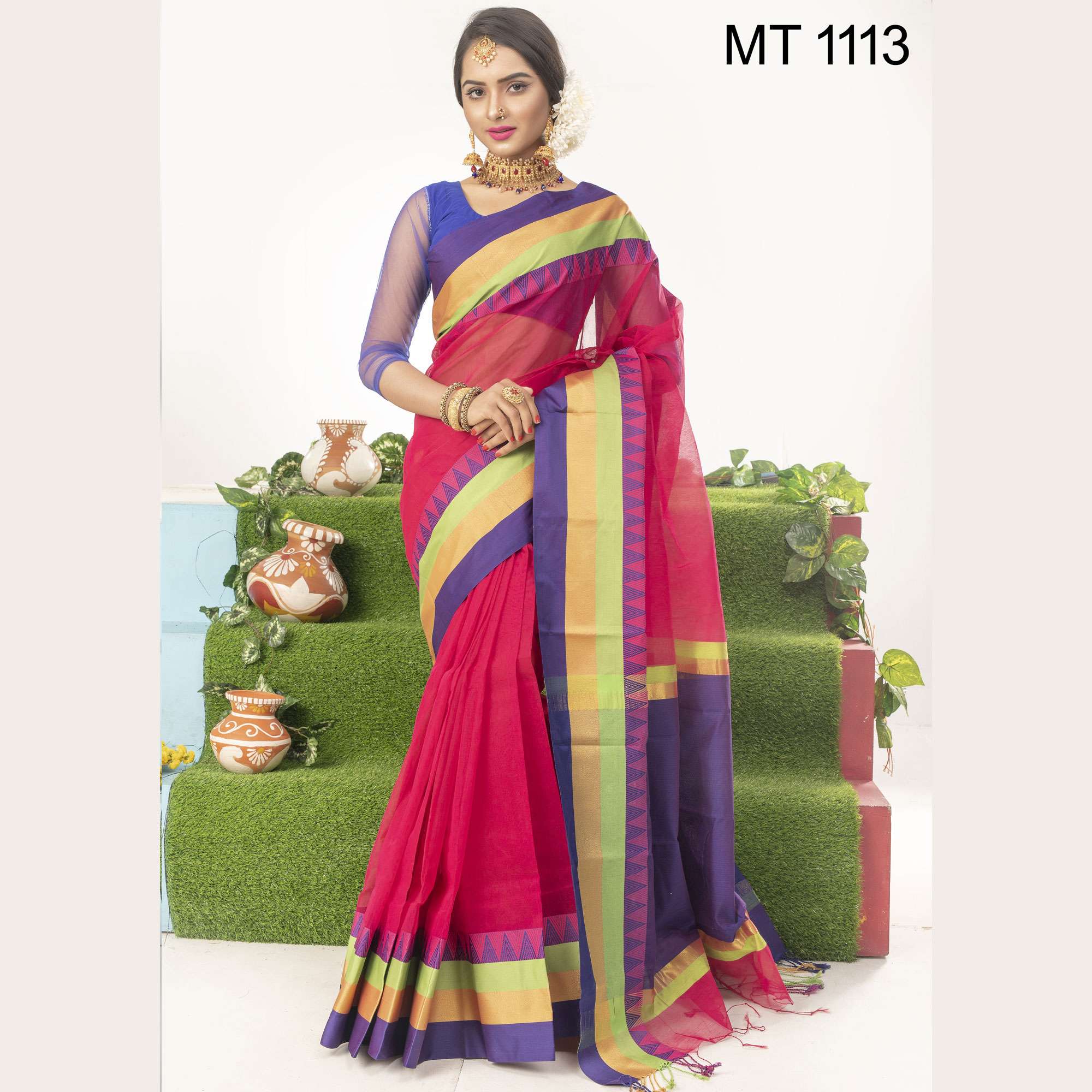 টাঙ্গাইল তাঁতের হাফ সিল্ক টেম্পল পাড় শাড়ী ব্লাউজ পিছ সহ (MT-1113)