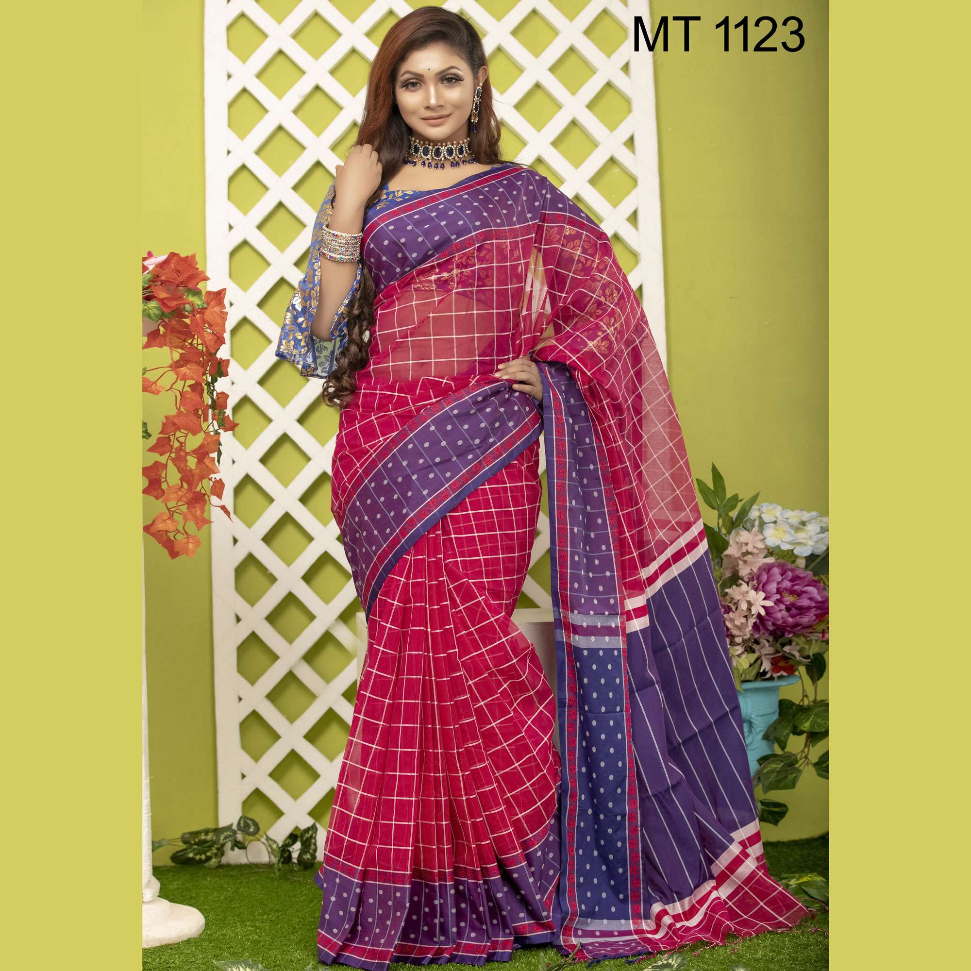 টাঙ্গাইল তাঁতের হাফ সিল্ক বুটি পাড় চেক শাড়ী ব্লাউজ পিছ সহ (MT-1123)