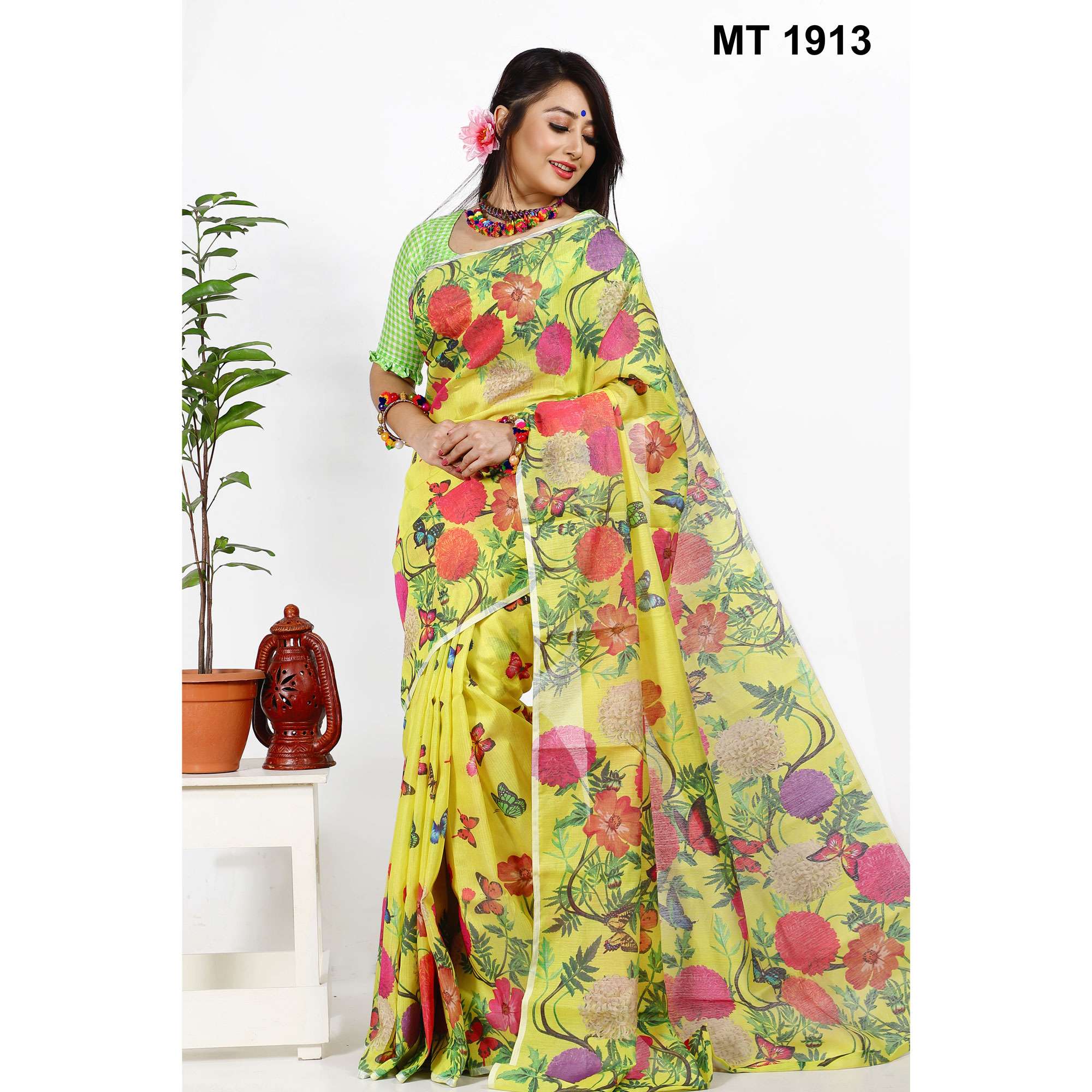 দারুণ নরম ও আরামদায়ক মাসলাইস সিল্ক ফেব্রিকে তৈরি। পুরো শরীরজুড়ে ডিজিটাল প্রিন্টেড ফুল ও প্রজাপতির নকশা। শাড়ির হলুদ পটভূমিতে বিভিন্ন রঙের ফুলের ছাপ, যা নজরকাড়া ও আকর্ষণীয়। আঁচলে ঘন ফুল ও প্রজাপতির ডিজাইন – একদম ইউনিক ও স্টাইলিশ দৈনন্দিন আয়োজনে, ঈদ, পূজা বা হালকা পার্টিতে পরার জন্য আদর্শ।