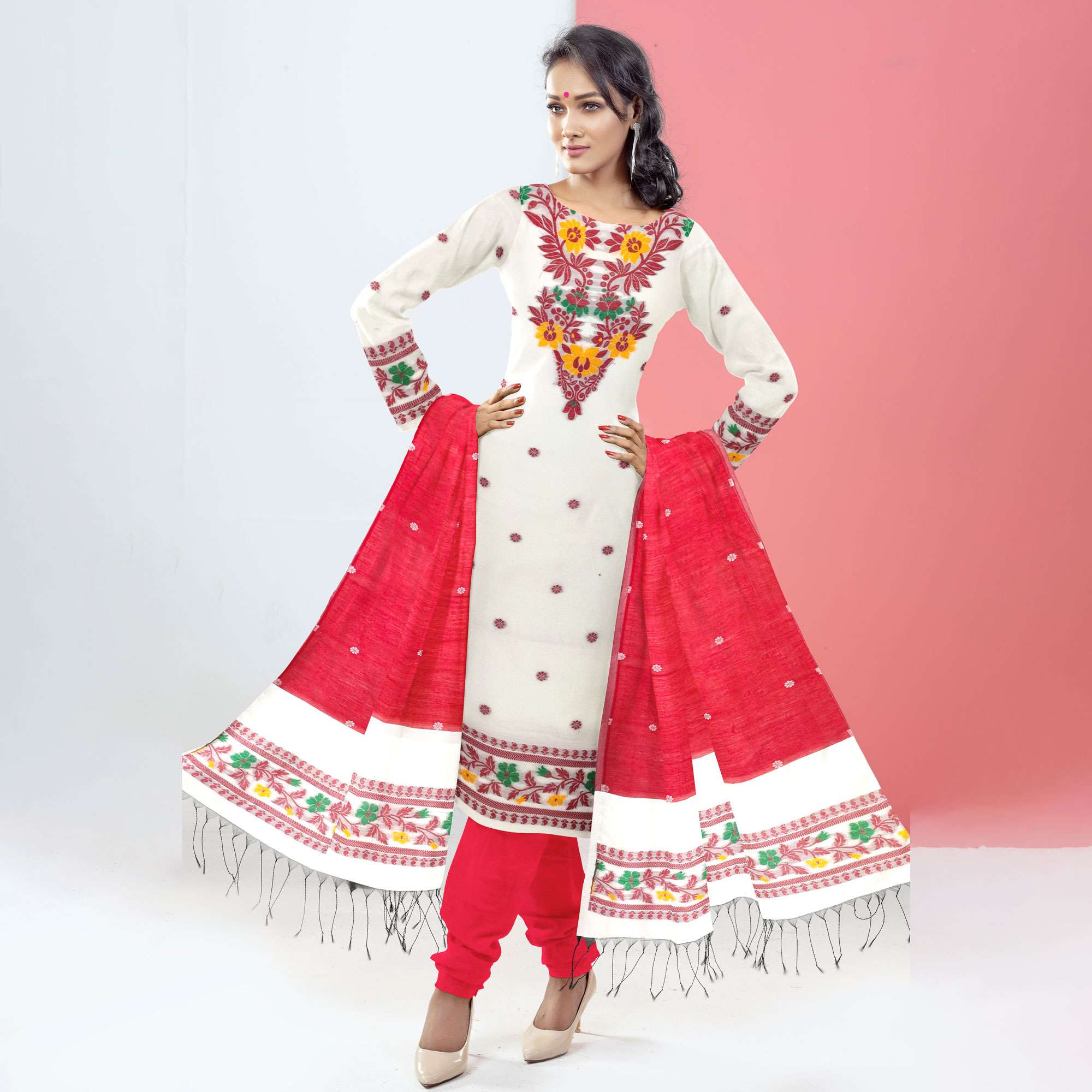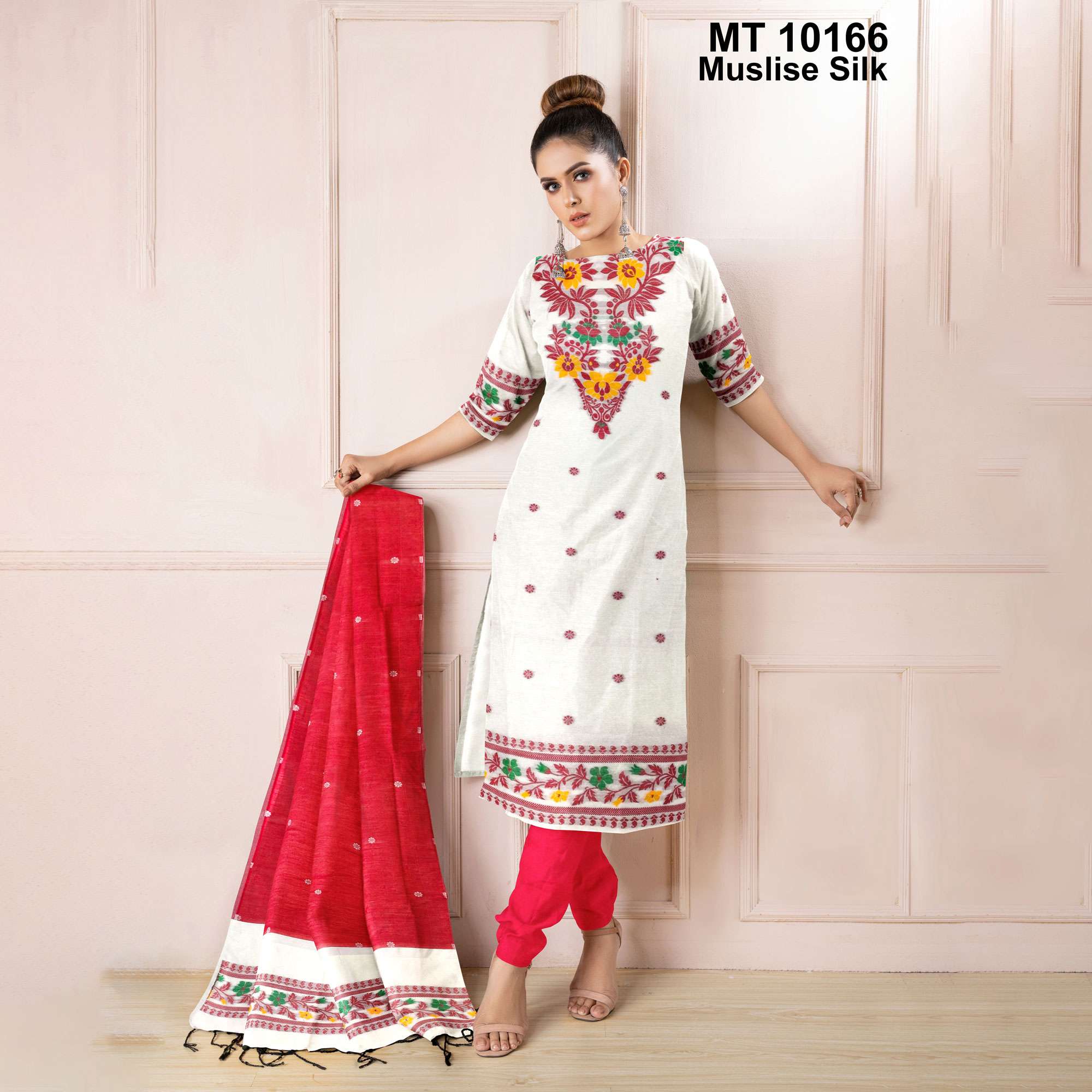 নরম ও মসৃণ মাসলাইস সিল্ক কাপড়ে তৈরি এই ঐতিহ্যবাহী তাঁতের থ্রি-পিসটি আধুনিক নকশায় সাজানো। পুরো সেটে রয়েছে সূক্ষ্ম সুতোর কাজ। জামা গলার ও পাড়ের ডিজাইন অত্যন্ত নান্দনিক, পায়জামাটি আরামদায়ক এবং ওড়নায় রয়েছে দৃষ্টিনন্দন তাঁতের কাজ ও ঝালরের পরিপাটি ছোঁয়া।