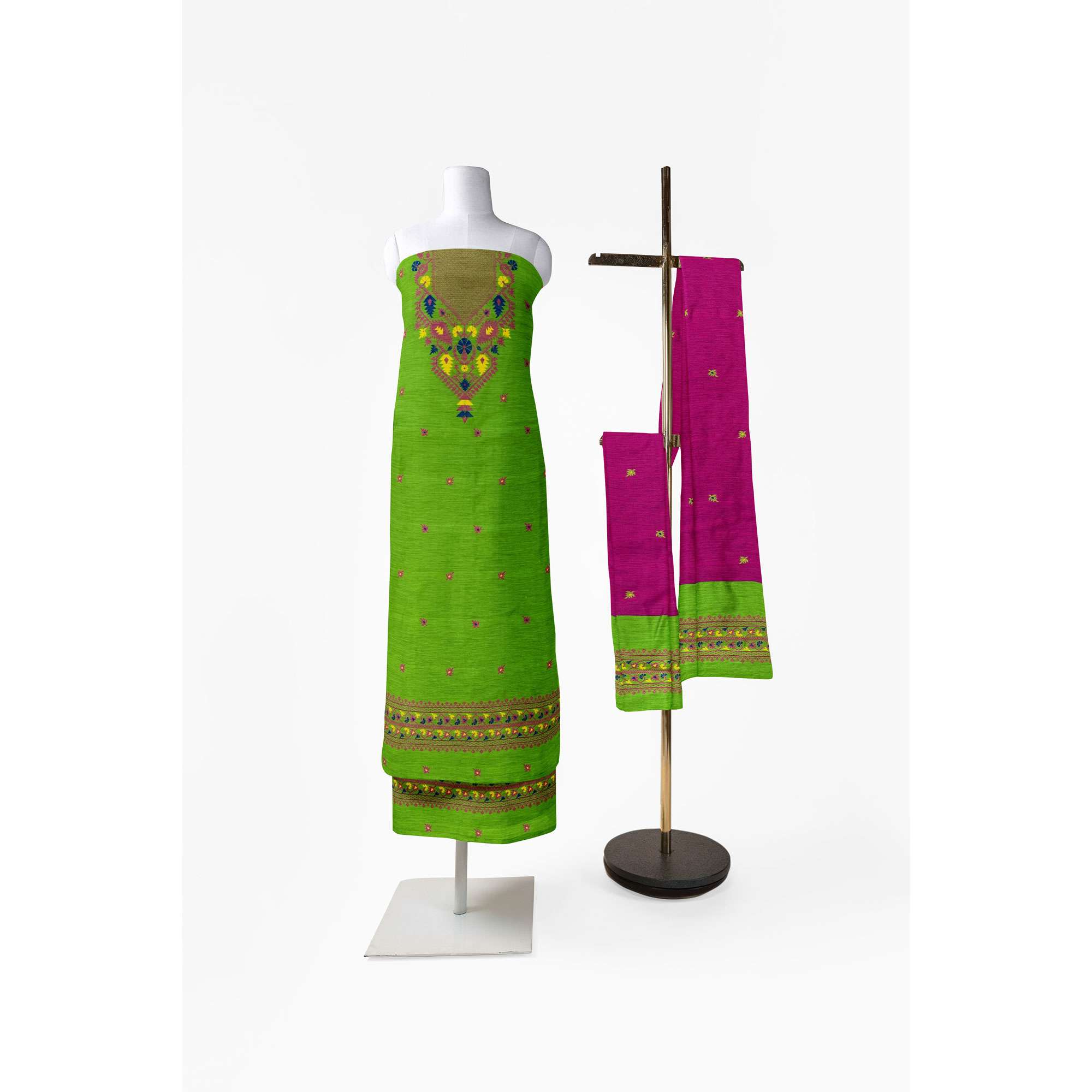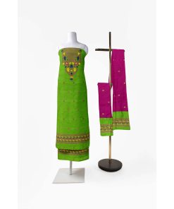 নরম ও মসৃণ মাসলাইস সিল্ক কাপড়ে তৈরি এই ঐতিহ্যবাহী তাঁতের থ্রি-পিসটি আধুনিক নকশায় সাজানো। পুরো সেটে রয়েছে সূক্ষ্ম সুতোর কাজ। জামা গলার ও পাড়ের ডিজাইন অত্যন্ত নান্দনিক, পায়জামাটি আরামদায়ক এবং ওড়নায় রয়েছে দৃষ্টিনন্দন তাঁতের কাজ ও ঝালরের পরিপাটি ছোঁয়া।